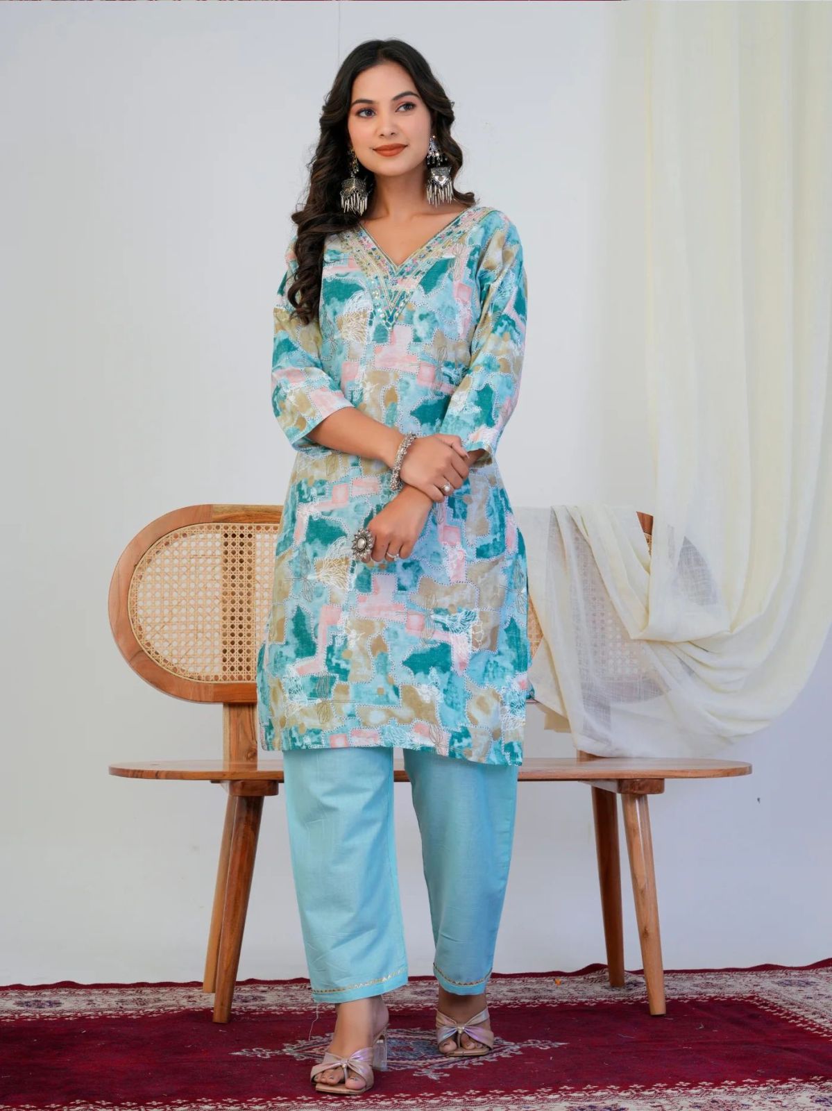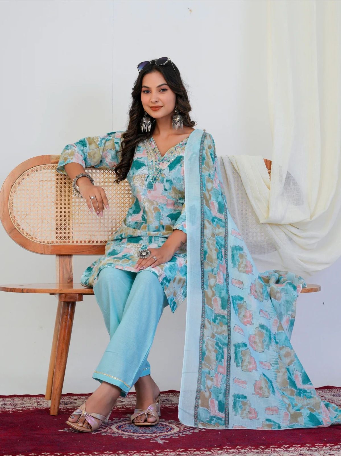 Aqua Blue Abstract Print With Handwork 3 Piece Suit Set