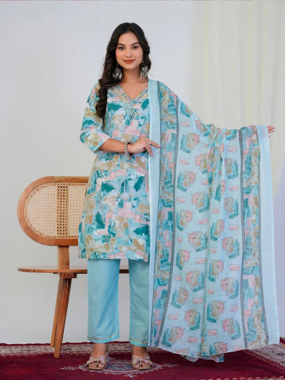 Looking for "Aqua Blue Abstract Print With Handwork 3 Piece Suit Set" ?