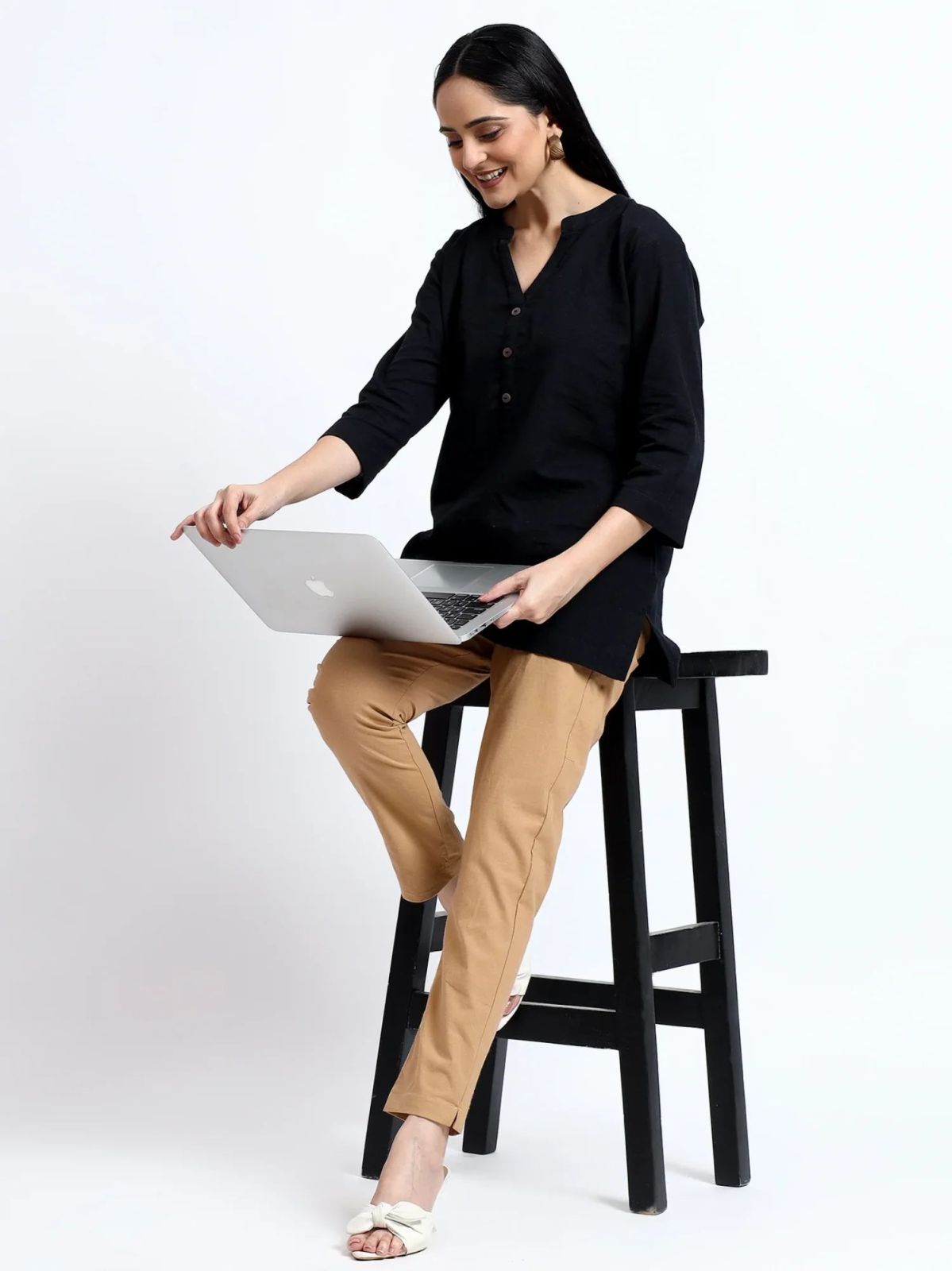We offer a versatile Black Brown Linen Cotton Short Kurta Pant Set in sizes ranging from S to 4XL. This Kurta Pant Set features a regular fit with 3/4th sleeves, making it perfect for formal occasions. The Kurta is crafted from a blend of 20% Linen and 80% Cotton with a stylish Mandarin collar and 3 wooden buttons. The accompanying pant is made from 100% Cotton with a mid-rise fit. Ideal for exporters, suppliers, and traders looking for quality ethnic wear options.