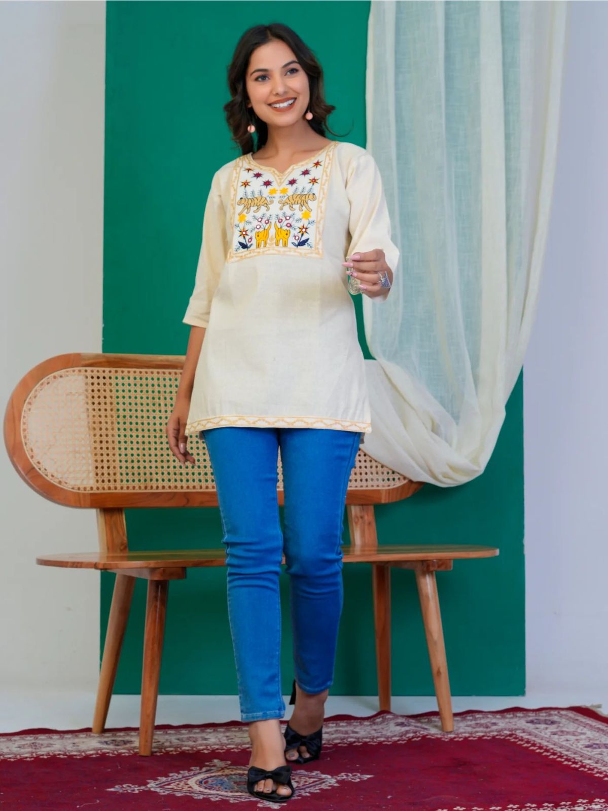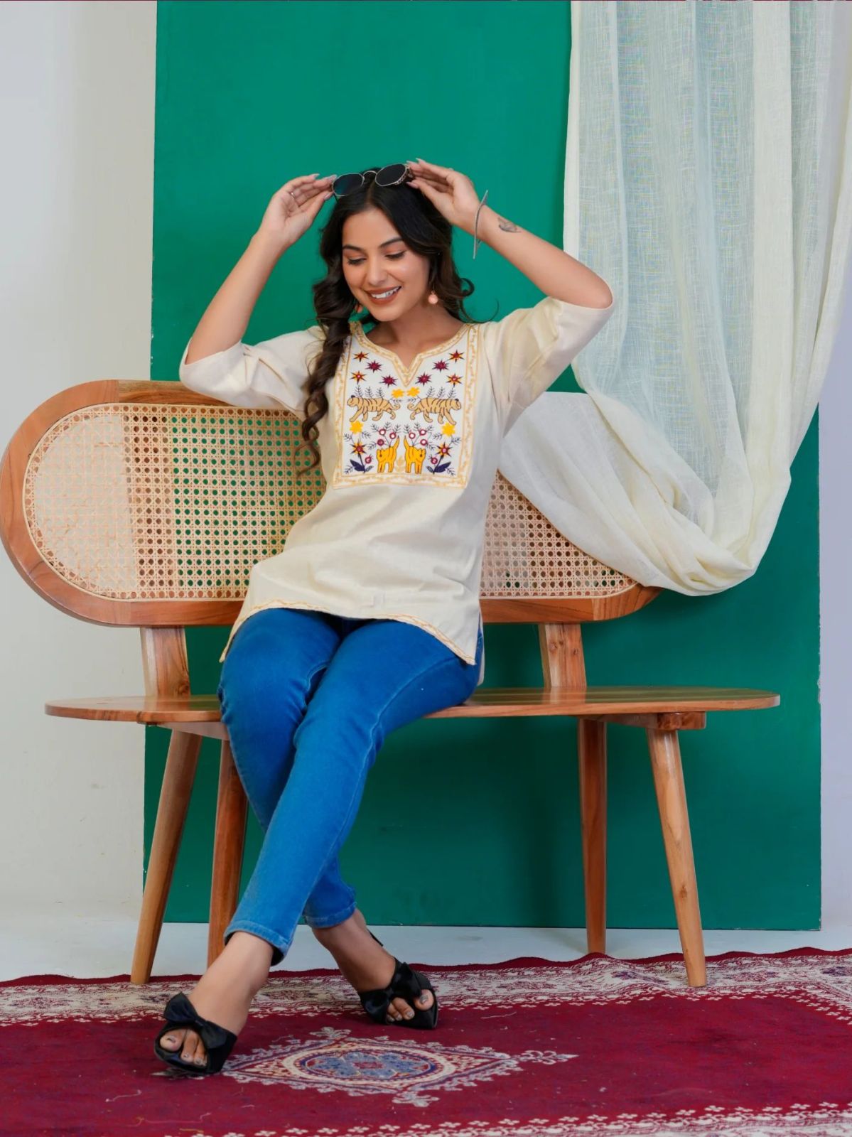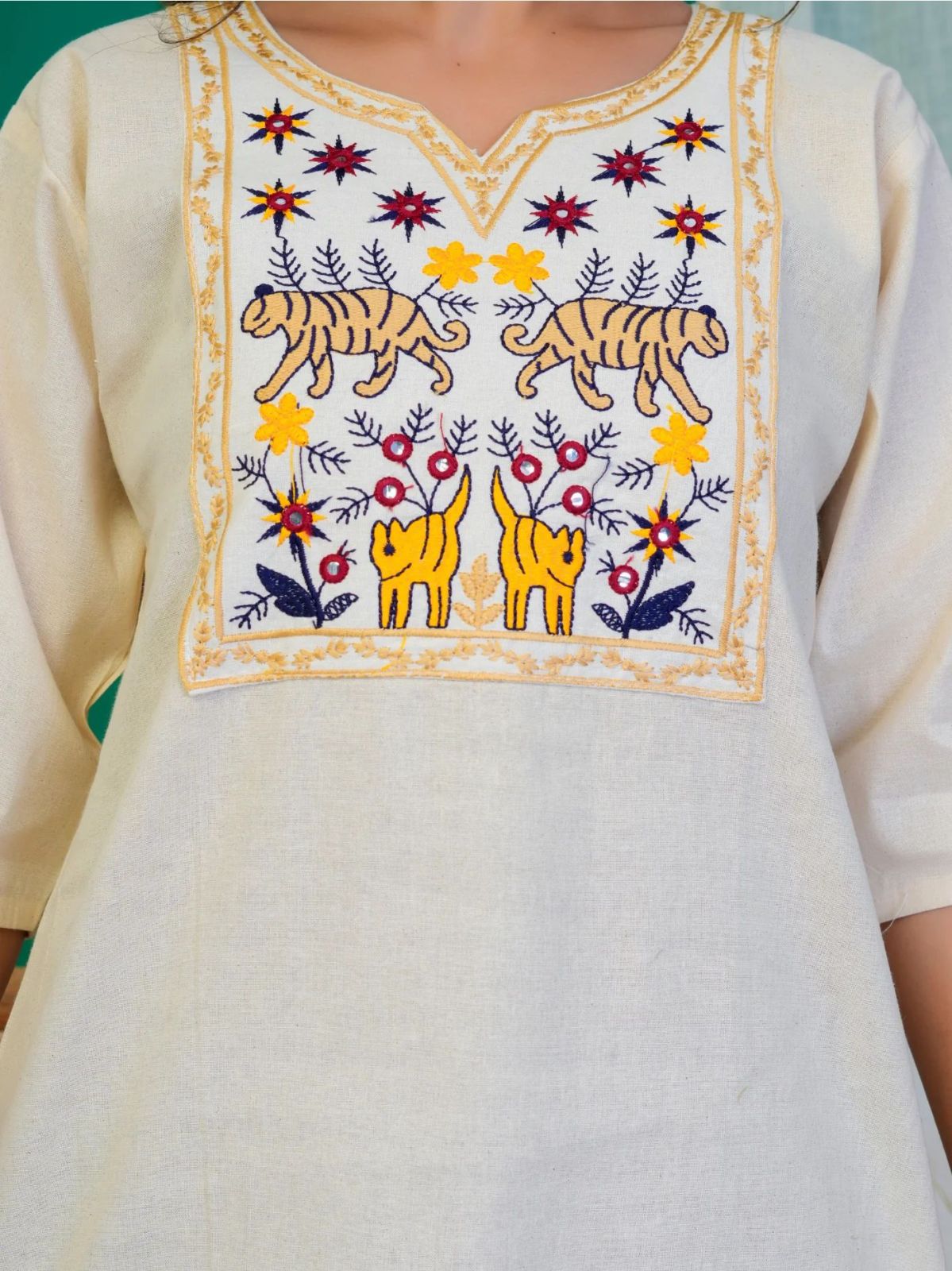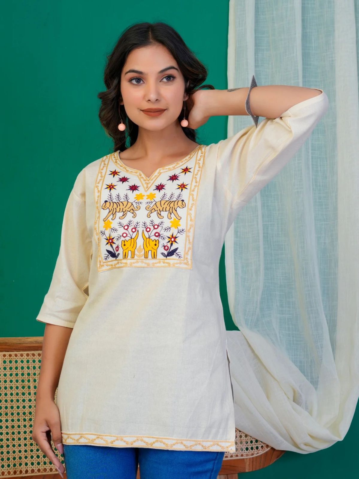 Home › Products › Embroidered Short Kurtis › White Tiger Motif Embroidered Ladies Short Kurti